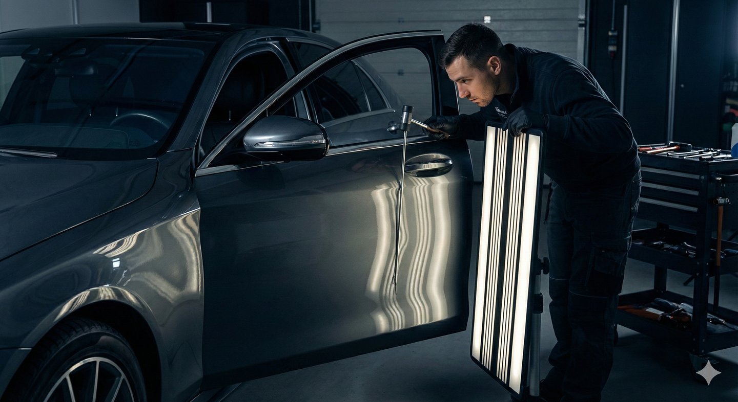 La técnica de Paintless Dent Repair (PDR) es la alternativa superior a la hojalatería tradicional para daños donde la pintura no ha sido fracturada. Mediante el uso de herramientas de palanca especializadas y una comprensión profunda de la metalurgia, masajeamos el acero o aluminio desde su cara interna para devolverle su "memoria" y forma original.